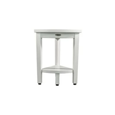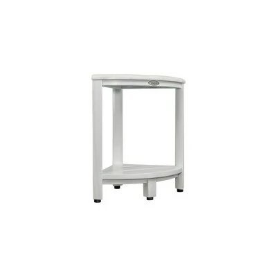 SnazzyCorner 12in Wide Teak Shower Bench with Shelf. With sides that each measure 12 inches long, with a height of 18 inches, it has a face that is 17 inches across. The included foot leveler pads allow independent adjustment of each leg to make minor adjustments for slight slopes in shower floors and to provide added non-slip stability. This piece features our Antique White finish, which is mostly white, with the yellows and browns from the teak showing through.