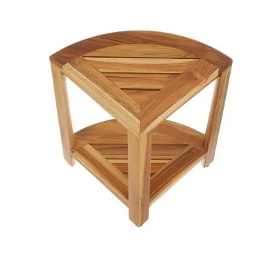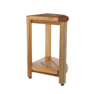 SnazzyCorner 12in Wide Teak Shower Bench with Shelf. With sides that each measure 12 inches long, with a height of 18 inches, it has a face that is 17 inches across. This unique product functions as a storage organizer and a bathroom bench, with a weight capacity of 250 lbs. The included foot leveler pads allow independent adjustment of each leg to make minor adjustments for slight slopes in shower floors and to provide added non-slip stability. This piece features our natural teak finish making it perfect for any home.