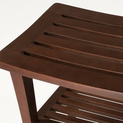 - Simple rectangle acacia wood (Acacia Mangium ) shower stool with slatted seat and fixed bottom shelf built to withstand exposure to water, moisture, humidity and the outdoors