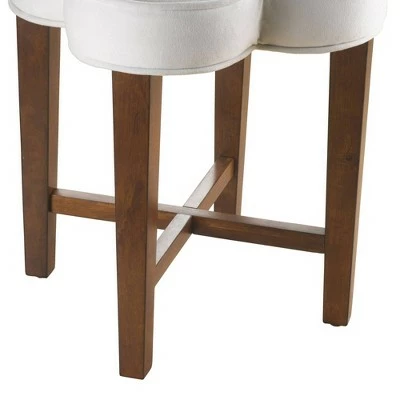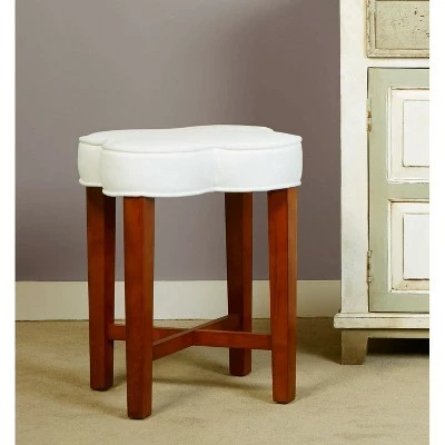 - Clover-shaped backless wood vanity stool with White upholstered seat accented by a center button tuft