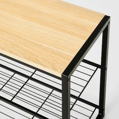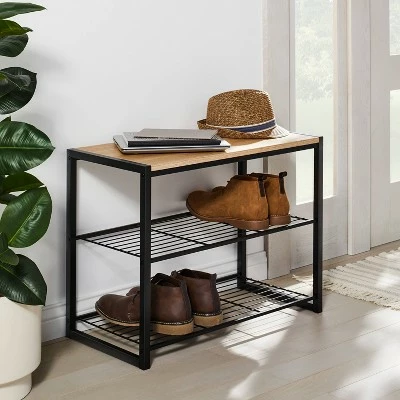 Keep shoes off the floor and the entryway uncluttered with the 3-Tier Entry Bench in Black Metal with Natural Wood from Brightroomâ„¢. This entry bench is a great pick for keeping any space organized, but it’s particularly convenient for a closet, entryway or mudroom. The two shelves are perfectly sized to each hold a few pairs of shoes, or combine with organizers for handy shelf storage. This metal entry bench includes a natural wood top for placing a hat, keys and more, and the black finish easily coordinates with any décor theme.