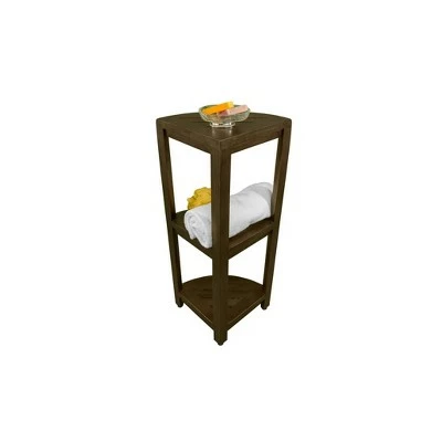 SnazzyCorner 32in Tall Teak Shower Shelf for Corners. With sides that each measure 12 inches long, this 3 tier bathroom organizer measures 32 inches tall, and has a face that is 17 inches across. The included foot leveler pads allow independent adjustment of each leg to make minor adjustments for slight slopes in shower floors and to provide added non-slip stability. In a beautiful woodland brown, this bathroom shelf will look great in any home.
