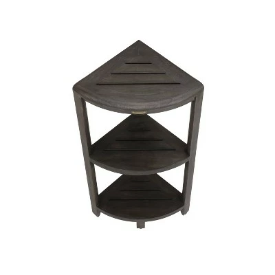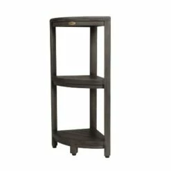 SnazzyCorner 32in Tall Teak Shower Shelf for Corners. With sides that each measure 12 inches long, this 3 tier bathroom organizer measures 32 inches tall, and has a face that is 17 inches across. The included foot leveler pads allow independent adjustment of each leg to make minor adjustments for slight slopes in shower floors and to provide added non-slip stability. This piece features our Antique Gray finish, which is mostly gray, with the yellows and browns from the teak showing through.