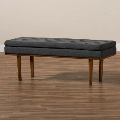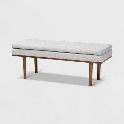 Chic and functional, the Arne bench is a sublime addition to any space. This wood bench is upholstered in a soft, neutral fabric that complements the walnut brown finish on the wood. Ample seating comfort is provided by plush foam padding. Button tufting adds a tailored look. Inspired by mid-century design, the Arne features a low silhouette and tapered legs. This versatile piece is well suited for placement in the entryway, living room, or bedroom. The Arne bench is made in Malaysia and requires assembly.