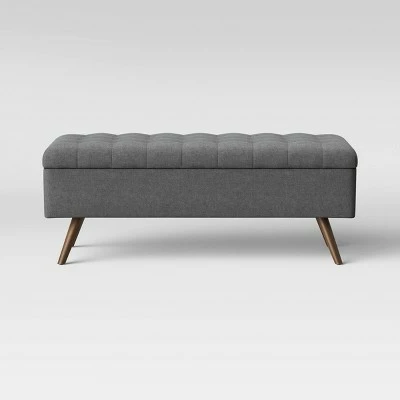Give your living space style as well as function with this Arthur Tufted Storage Bench from Project 62™. This upholstered accent piece features a wood-like frame held by four elegant, slanted legs, adding a sense of depth, dimension and texture to your space, while an interior storage unit offers ample space to keep your home organized. The tufted bench can act as both a spot to sit and a decorative accent piece. Perfect for storing extra blankets, board games and more, this cushioned bench easily brings a modern accent to your entryway, living room and more.