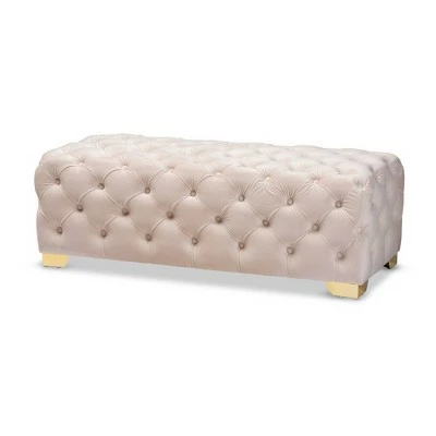 Add glamour to any space with the Avara ottoman. This plywood ottoman is upholstered in a sumptuous velvet fabric that displays a subtle sheen. All-over button tufting and lustrous gold-finished metal legs elevate the Avara to new heights of luxury. Place this stunning piece in the entryway or at the foot of the bed. The Avara bench ottoman is made in China and will arrive fully assembled.