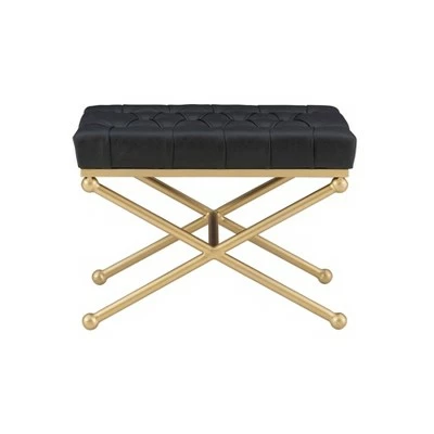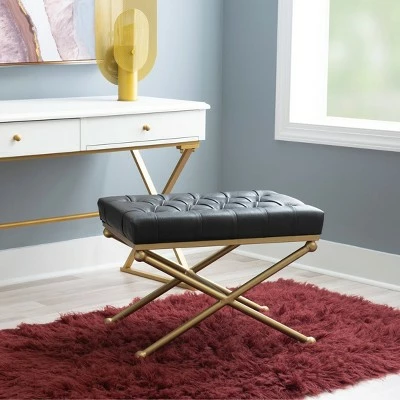 An ode to extravagance of a lost era, this stool is a flashy option for extra seating or a foot stool in your bedroom, home office or living room. The iron frame stands in a sturdy x pattern and is covered in a gold powder coating that shines in the light. Positioned above the base is a tufted cushion covered in black faux leather for comfort and easy upkeep. This piece arrives fully assembled equipped with feet glides to protect your floors.