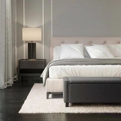 This storage ottoman is a versatile addition to any home. It offers multiple storage space options such as linens in bedrooms or board games and blankets in living rooms, the choices are endless. Wrapped in a soft polyester that’s durability stands up to stains and wear and tear. Supported by dark brown legs and a nailhead trim it is as stylish as it is practical. The ottoman’s classic design makes it easy to assemble and disassemble for storage or to move to the room of your choice.