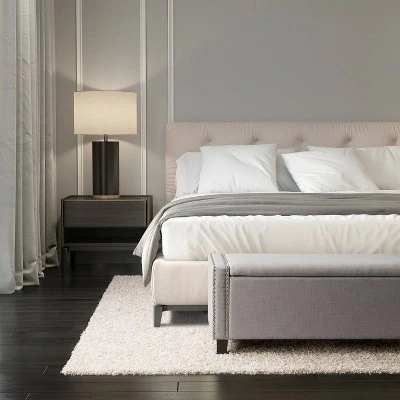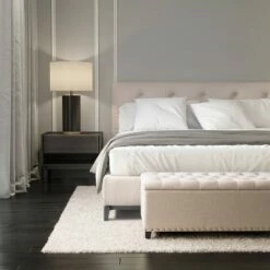 This storage ottoman is a versatile addition to any home. It offers multiple storage space options such as linens in bedrooms or board games and blankets in living rooms, the choices are endless. Wrapped in a soft polyester that’s durability stands up to stains and wear and tear. Supported by dark brown legs and a nailhead trim it is as stylish as it is practical. The ottoman’s classic design makes it easy to assemble and disassemble for storage or to move to the room of your choice.