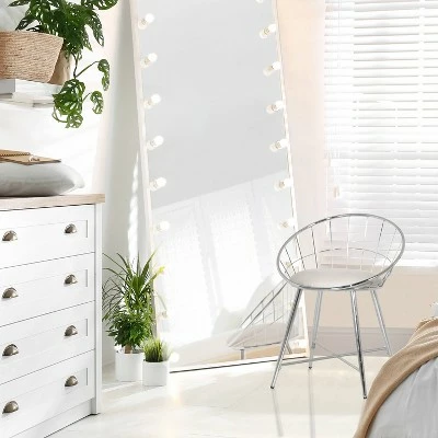 The round disc metal vanity stool has a retro design with a ultra modern style. The dazzling wire basket back design with metal construction in a chrome finish give the stool an inviting and futuristic touch. The comfortable round seat is upholstered in a neutral cream velvet fabric. The open metal work gives the metal vanity stool a lightweight translucent look which fits seamlessly into any decor. Ideal for your bathroom or bedroom seating area. Assembly required.