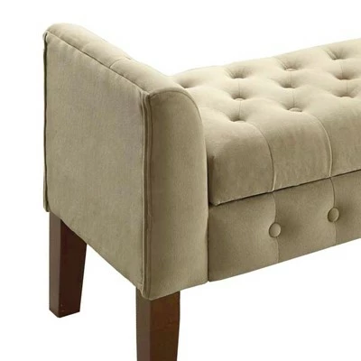 Revamp your home in an elegant way with this luxurious looking storage bench settee. Made up of using plywood and wood with the beige colored soft premium velvet upholstery, this designer bench settee features padded seat and slightly flared arms with all over button tufted detailing. It has wooden tapered legs in a dark walnut brown finish that provide good support to the complete structure. An easy hinged top offers ample storage that is suitable for hiding spare throws, pillows, extra books, magazines or toys with extra seating space in a living room.