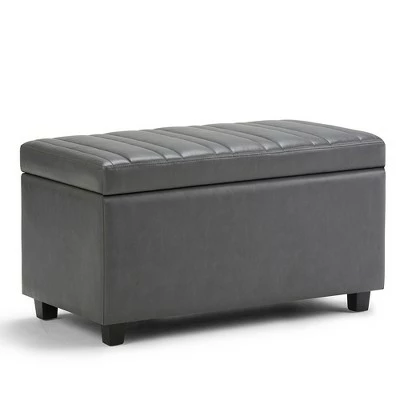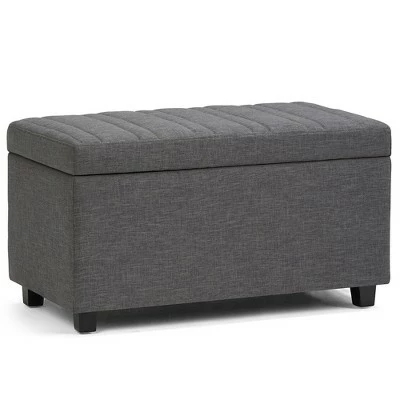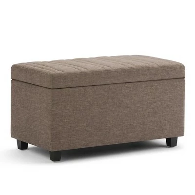 Callum 34 inch Wide Contemporary Storage Ottoman comes with child safety hinge to prevent lid slamming. Large interior storage. Available in Tanners Brown, Chocolate Brown, Midnight Black, Satin Cream, Crimson Red, Stone gray Faux Leather or Slate gray, Dove gray, Fawn Brown Linen Look Fabric. Simple assembly; just attach legs. Efforts are made to reproduce accurate colors, variations in color may occur due to computer monitor and photography. The product is warranted to be free from defects in material and workmanship to the original owner for the life of the product (conditions apply).