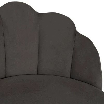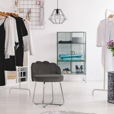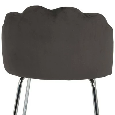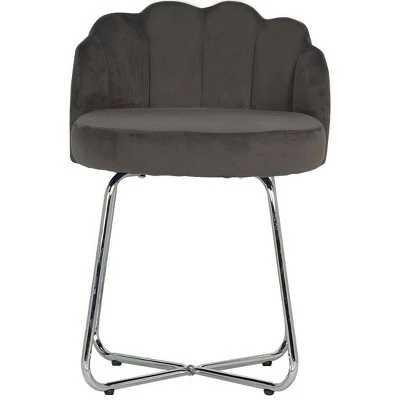 When it comes to turning heads, this scallop back vanity stool is a showstopper for any room. The beautiful dark gray velvet fabric is rich and luxurious, while the channel back adds style and comfort. The chrome finished metal legs create the perfect support with a crisscross base. The balance of sophistication and stunning design elements provide elegance to any vanity, bathroom or as an accent chair in any room. Assembly required.