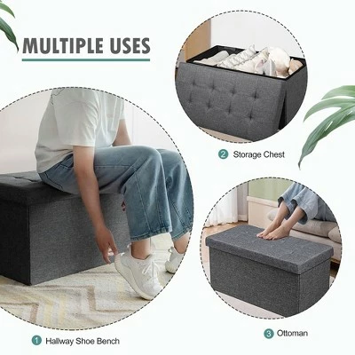 Combining elegant appearance and practical functions, our foldable storage ottoman will be your ideal choice!. The overall frame is constructed of high-quality MDF, which ensures a high load bearing capacity without easy deformation. Besides, the soft fabric covering and thick padded seat provide a great sitting experience. Roomy interior storage space with a hanging box can meet the needs of storing clothes, blankets, shoes and other daily necessities. Equipped with detailed instructions, the storage ottoman can be assembled quickly. And it can also be easily folded when not in use which takes little space. . Specification: Color: Grey Dark Grey. Material: Oxford Fabric + MDF + Sponge. Overall Dimension: 31.5” x 16” x 16” (L x W x H) . Inner Dimension: 30.5” x 14.5” x 14” (L x W x H) . Dimension of Hanging Box: 14” x 8” x 4” (L x W x H) . Weight Capacity: 350 lbs. Net Weight: 15 lbs. Package includes: . 1 x Foldable Storage Bench. 1 x Instruction.