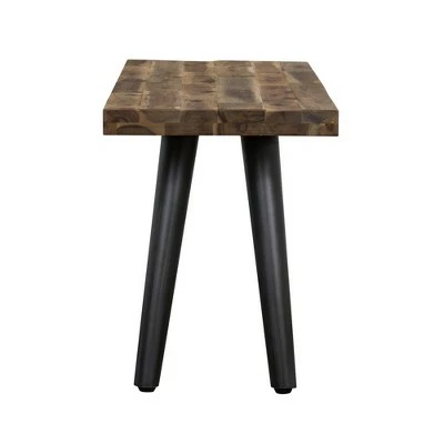 The Armen Living Cusco Acacia Rustic Bench is a multifunctional piece; and easily fits into your dining room, living room or at the end of your bed. The bench is 55 inches wide and features a beautiful antique acacia finish. The metal legs give this bench a modern touch without compromising its warm rustic aesthetic. The Cusco collection expands to multiple rooms in your home. Coordinating bedroom, living room and dining room pieces not included. All available in an antique acacia finish with black metal accents.