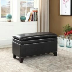 This contemporary and stylish storage bench is designed to adapt to any room while providing additional seating room for you and your guest. With the conveniently wooden bar storage space making this bench quite practical for holding books and magazines, up to 3 cubic feet (37″ x 17″ x 9″). The seat flap is designed with double hinge mechanism for easy opening or securely sleek and tight closing when needed. The bench is finished with stylize brown leather that compliments the brown finished wood storage space for a modern decor feel. The sturdy internal frame is supported with wood. Minimal assembly required.
