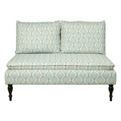 Invite comfort with this charming pillow-cushioned high-backed bench, featuring an open, armless design that’s perfect for curling up with a cup of tea or a favorite book. Generously padded in both the elongated seat cushion and two zipper-closure loose back cushions, it offers both comfort and style. The viscose-blend fabric is finished in a beautiful soft blue and cream ogee design, while webbed construction underneath provides ample support. Four dark-finished legs – a fully turned pair in front, a pair that’s squared for support in the back – anchor the style and provide a pop of contrast. The perfect style for use as an entryway bench or dining bench, you’ll love the way it looks and feels in your home.
