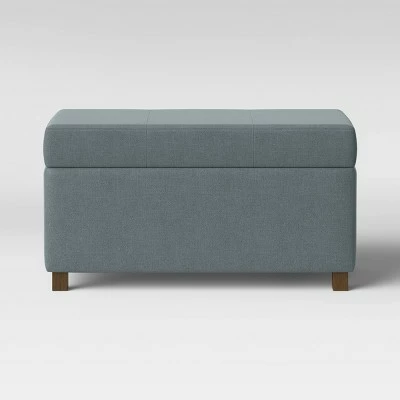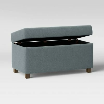 Mix sophisticated style and convenience with the Essex Basic Storage Bench from Threshold™. Perfect for supporting your feet while you read, watching television or just sitting back and relaxing, this ottoman combines a classic design with modern flair. The faux leather cover gives a timeless touch that adds a functional yet stylish accent to any room. The hinged seat cushion allows for quick and easy storage, perfect for housing blankets and pillows when not in use.