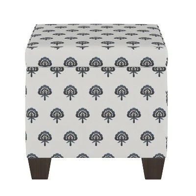 Eye-catching design and functional flair come together in the Clara Navy Block Fairland Storage Ottoman from Thresholdâ„¢. This ottoman comes in a simple square shape that makes it easy to incorporate into an array of spaces in your home, looking just as good tucked neatly into a corner as resting against the foot of the bed. The white ottoman pops with an allover pattern of navy fan-like designs for a charming look that will perfectly complement both neutral and more boldly colored furniture and throw pillows. The top of the ottoman lifts off to provide you space to stow away spare blankets, media accessories or anything else you want close at hand but out of sight. Able to hold up to 250 pounds, this ottoman can also be sat upon when extra seating is needed.