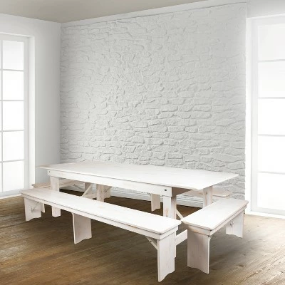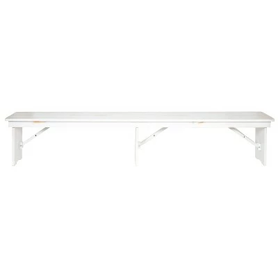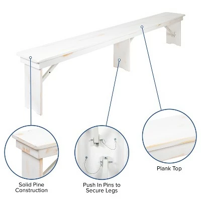 Add charm and beauty to your home with this rustic farmhouse style bench. This wood dining bench looks lovely when used in the entryway of your home or when paired with one of our solid pine farm dining tables. The plank top bench is beautifully constructed of solid pine that comfortably seats 3 to 4 people. Since there is no assembly required you can enjoy your purchase as soon as you receive it. Simply unfold the legs and push the pins in to secure in place while in use. This beautiful bench was designed to be used indoors but may be used outdoors for special occasions during good weather. To store your folding bench, pull the pins out and the legs securely lock underneath the seat. Whether you’re going for country or modern decor, this wood bench will add warmth to your entryway or dining room. Suitable for commercial use, this bench will be a distinct feature in restaurants. Additional Features: Legs Lock Underneath Seat, Folded Thickness: 3.25″, 16 Gauge Black Steel Posts, Push In Pins to Secure Legs, Pull Out Pins to Fold Legs