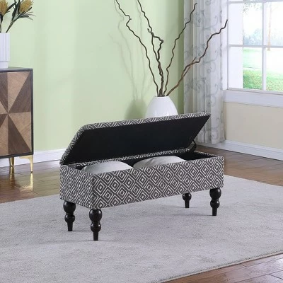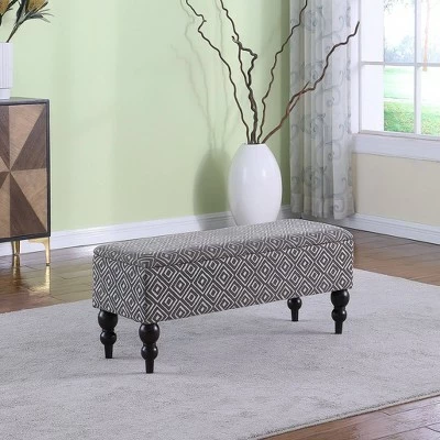 Insert this spacious geometric tile print storage bench in your room, and enjoy its versatile functionality. This piece serves as seating for your home when you’re not using it as a footrest or a serving platform, and it lets you tuck away blankets, magazines and whatever else you want to get up and off the floor to keep your room neat and tidy.