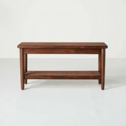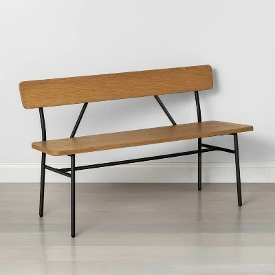 Infuse a warm, rustic ambiance into your indoor space with this simple yet stylish Wood and Steel Accent Bench Black from Hearth & Hand™ with Magnolia. Crafted from a sturdy and durable metal and wood frame, this spacious rectangular bench comes topped off with a flat, non-upholstered wooden seat and back in natural wood tones that contrast perfectly with the lush green finish on the metal frame. Lightweight and compact, this open-back bench sports a perfectly angled back that offers a comfy seating experience year-round. The natural wood tones blend seamlessly with any existing color palette and a variety of decor styles. Place anywhere in your home — from the foyer to the lounge — for an instant update.