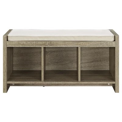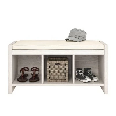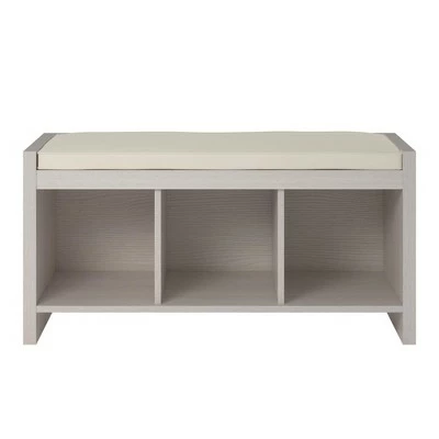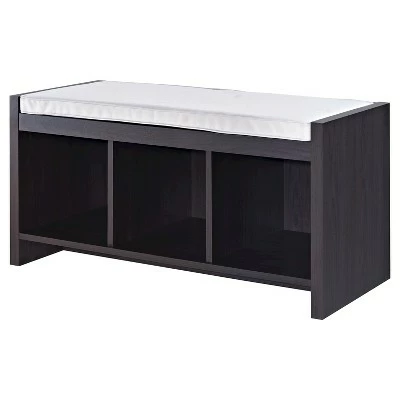Give your home an inviting look with the Room & Joy Hendland Entryway Storage Bench with Cushion. Fitting perfectly into small spaces, this unit measures in at a compact 17.68″h x 35.91″w x 15.75″d. Even so, it has a large top with a comfy cushion and 3 roomy cubbies to hold shoes, bags or books. The bench makes a great addition to a variety of home. Made from laminated hollow core and particleboard, this piece also looks great at the end of a hallway or as extra seating in the living room. Two people are required for proper assembly.