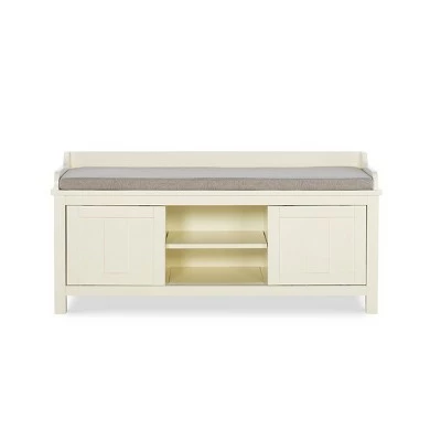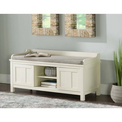The Lakeville Storage Bench is perfect for adding storage and seating to an entry or hall. The bench provides ample bottom storage space for shoes, books and toys. Sliding doors keep your items hidden from sight. The white finish is an easy addition to any space. A plush cushion adds comfort to the seat.