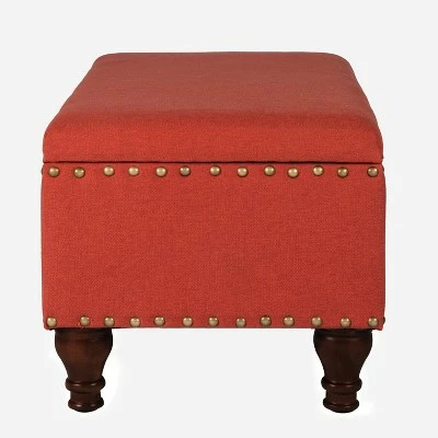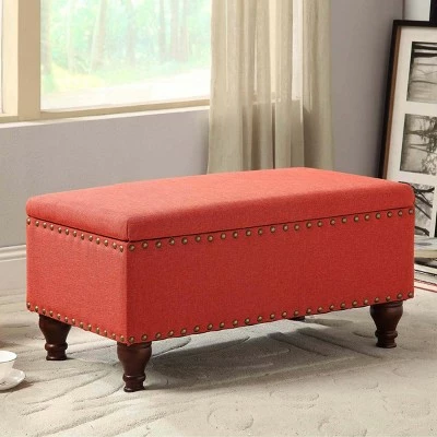 Add style and storage to any room in the home with this classic rectangle storage bench. Featuring timeless nailhead trim and spiral wood legs in a light cherry finish, this bench is a multi-tasker. Use it to provide extra seating or extend hospitality as a coffee table ottoman. Allow it to hold pillows or blankets as an end of bed bench. Strategically position it in an entryway or mudroom to contain outdoor accessories or shoes. Undeniably a premium addition to any home at a reasonable price, make this the next accent furniture investment. Easy to assemble and maintain.