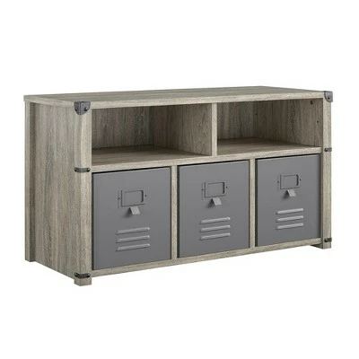 - 2 open storage cubbies on top and 3 lower cubbies for bins, 3 locker style fabric bins with metal fronts included