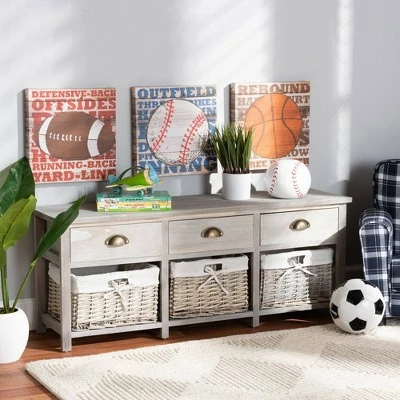 Develop your entryway with the modern convenience of the Mabyn storage bench. Made in China, this bench is comprised of a sturdy wood frame fitted with wicker baskets. Three drawers and three baskets expand the storage potential of any space while smooth metal drawer knobs adorn the bench with industrial charm. The Mabyn will arrive fully assembled and utilizes fabric liners in its baskets for a contemporary touch. A versatile addition that exudes modern charm, the Mabyn storage bench elevates the potential of any space.