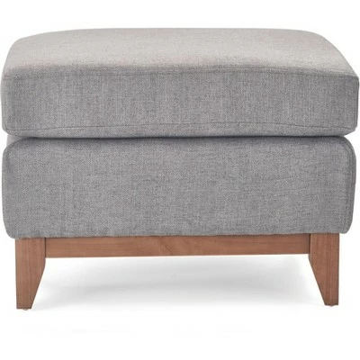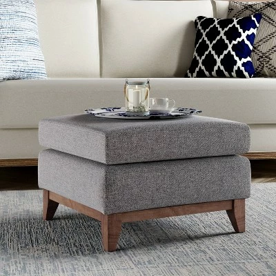 Create a stylish and functional accent to your living or family room with this convenient and comfy ottoman. The contemporary design is a sleek addition to your modern decor. Neutral toned upholstery works will in any room, and is easy to clean and maintain. You’ll love the way the warm, inviting exposed wood base and legs create a visual accent in your room. This modern ottoman is the perfect rest for your feet and a tray of snacks at the end of the day.