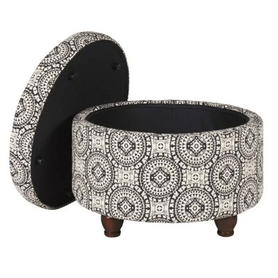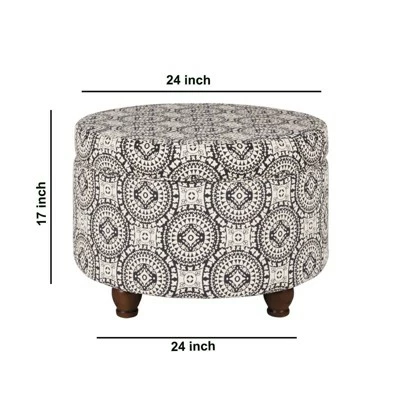 This ottoman is aesthetically cultivated with sophistication to give home interior an instant makeover. Made up of quality wood, this traditionally fashioned ottoman will make a perfectly decent extra seat to comfortably accommodate your guests and hide commodities. This classic round storage ottoman in a modern medallion pattern fabric upholstery; features a lift off lid and wooden bun feet in a dark walnut brown finish. This functional accent piece is perfect for storage, seating purposes, or can be used as a serving stool or to rest feet when tired. With neutral cream and black finish, this ottoman is scaled to fit in a smaller space.