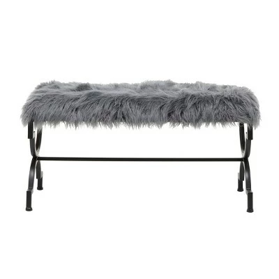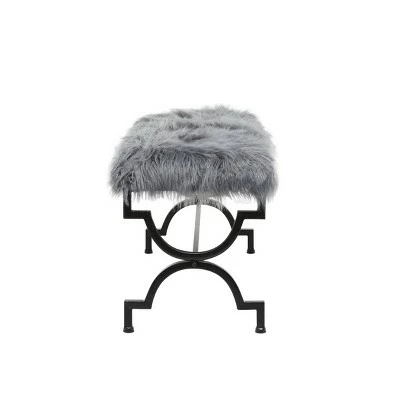 - Faux fur bench features a fluffy gray fur seat and polished black metal legs