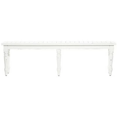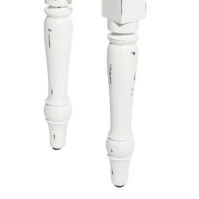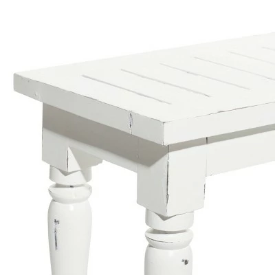 - Wooden bench features a distressed white finish