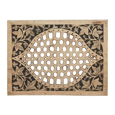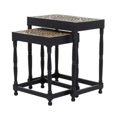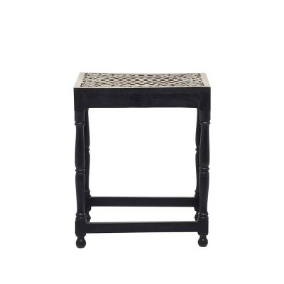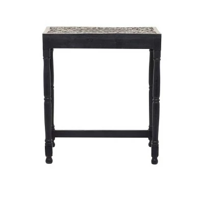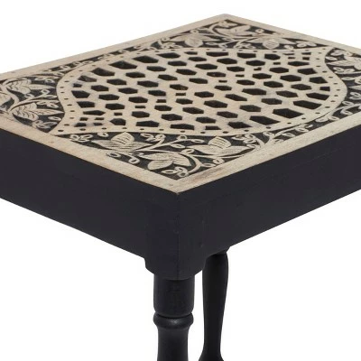 Add an enchanting touch of carved wooden pieces into your living room area as you place this table and stool pairing with light toned walls and nude colored furniture. A compact friendly table providing you with additional storage space any where in your home. Useful and elegant, side tables are more than just a place to throw your mail or place a lamp. Designed with thin rubber stoppers at the base that prevent scratching furniture and table tops, as well as sliding around. This item is shipped in one carton. Wood is cut and intricately carved to form an elegant set of accent tables and chairs. Due to the handmade nature of this item, no two will be alike, there will be slight differences in shape, size, and color. Suitable for indoor use. Made in India. This item comes as a set of 2. Eclectic style. Maximum weight limit is 250 lbs.