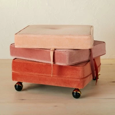 Enliven your home decor with the Marin Stackable Pouf with Casters from Opalhouse™ designed with Jungalow™. Draped in soft fabric upholstery in a velvet finish, this decorative square pouf is generously filled to offer you a cozy spot to perch. This upholstered pouf features a three-tier design with a loop and a tie cord attached to each piece that can be untied to create three comfy footrests or low-floor poufs. Plus, the casters at the bottom make it easy to move from one spot to another. Featuring contrasting solid hues, it’s sure to elevate your boho-inspired decor, while adding functionality to your space.