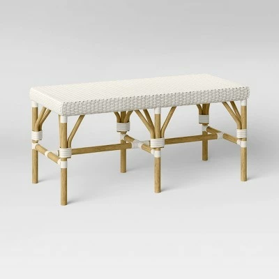 The Perry Rattan Woven Bench from Threshold™ is the perfect combination of sleek geometric lines and natural textures. Seating up to two people comfortably, this backless bench features a woven rattan seat in cream, and it stands atop six legs and a trestle base in light brown for a beautiful pop of contrast. Wraparound accents in a complementing cream on the light brown frame add extra visual interest, and its lightweight and transitional design works in most decor schemes while adding a breezy, decorative element to any room. Place this versatile woven accent bench by your front door to easily put on or take off your shoes, or use it as additional seating in the living room and accent it with cozy pillows.