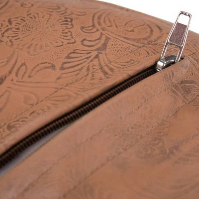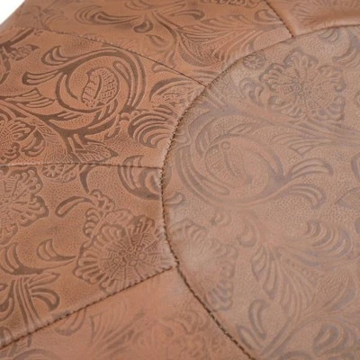Make a tasteful addition to your home décor with the Rogen Round Pouf. The pouf is upholstered in a patterned genuine buffalo leather with stitching detail. Can be used as an ottoman or extra seating. This versatile pouf is sure to enhance the style of your space.