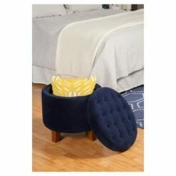 - Round ottoman creatively hides essentials out of sight and provides additional comfortable seating.