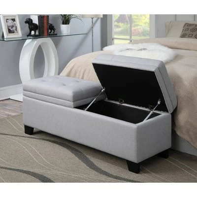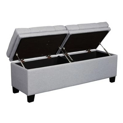 Whether you’re making the most out of small space living or just want to add more functionality to your furnishings, this smartly-styled upholstered storage bench is the answer. A split-cushioned seat incorporates button tufting and stitching for plush, inviting comfort on the top. Lift the edge of either seat and smooth gas-lift hinges will reveal a roomy storage space – perfect for linens, shoes, books, and other personal belongings. Two distinct storage compartments – one beneath each seat – double your organization options and make this bench a must-have.