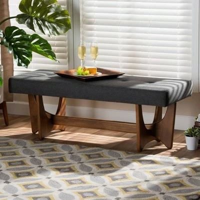 Smooth curves and netural tones make the Theo bench a chic addition to any space. Constructed from wood, the Theo is upholstered in a soft gray polyester fabric. Plush foam padding provides comfortable seating, while button tufting adds a tailored look. The seat is set on a unique base of interlocking forms, each finished in a walnut brown. Place this bench in the entryway, living room, or bedroom. The Theo bench is made in Malaysia and requires assembly.