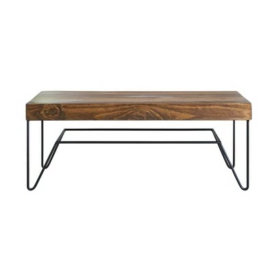 The Picket House Furnishings Tyler Standard Height Dining Bench is going to look oh so chic in your home! This dining room staple features a fixed seat, paired with powder coated, black metal legs. This top is made of solid, Brazilian pine wood ensuring it’s sturdiness over the years. This dining bench is a unique piece of furniture and no two pieces are the exact same. There are color and grain variations within each piece of wood. The cracks and dents featured are not blemishes but rather beauty marks which enhance the appearance.