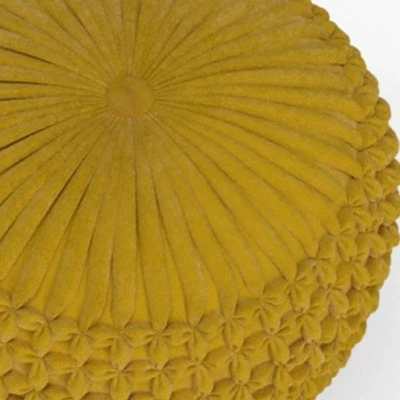 - Versatile round shape featuring a button tufted pleated top and unique tufted detail sides